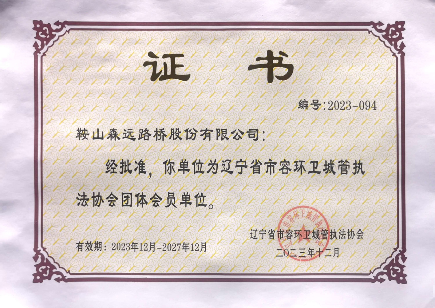 辽宁省市容环卫城管执法协会会员单位-证书